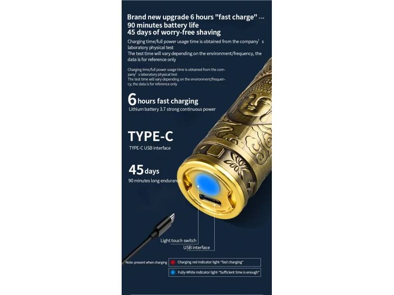 Αυτή η συσκευή διαθέτει εργονομικό σχήμα, εύκολη στη χρήση, δεν αγγίζει ή ερεθίζει το δέρμα. Διαθέτει κουμπί ON/OFF στη βάση του, και η φόρτιση γίνεται μέσω του καλωδίου USB που περιλαμβάνεται στη συσκευασία.