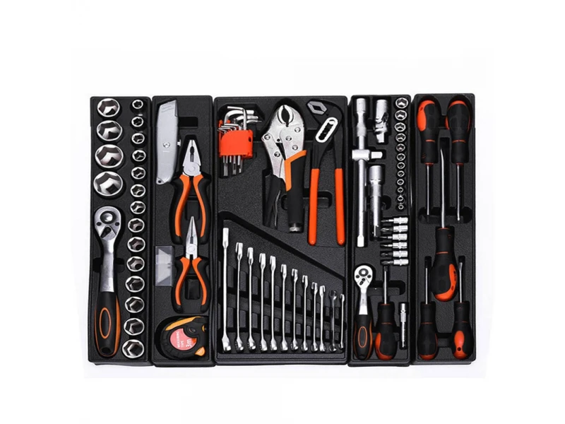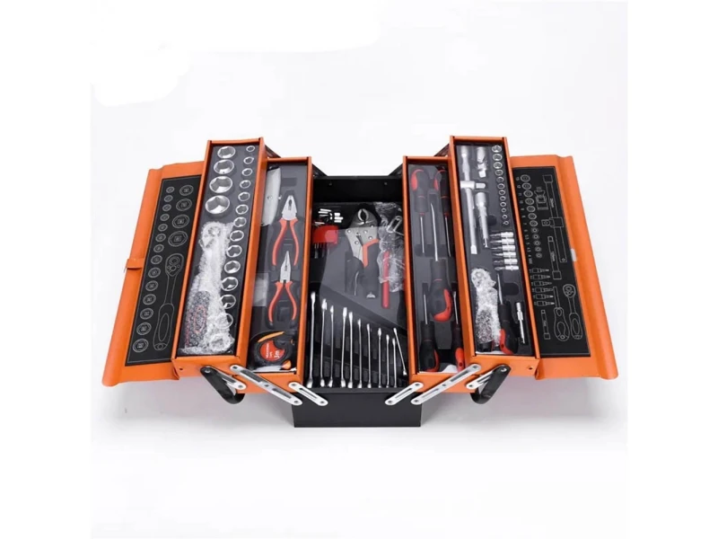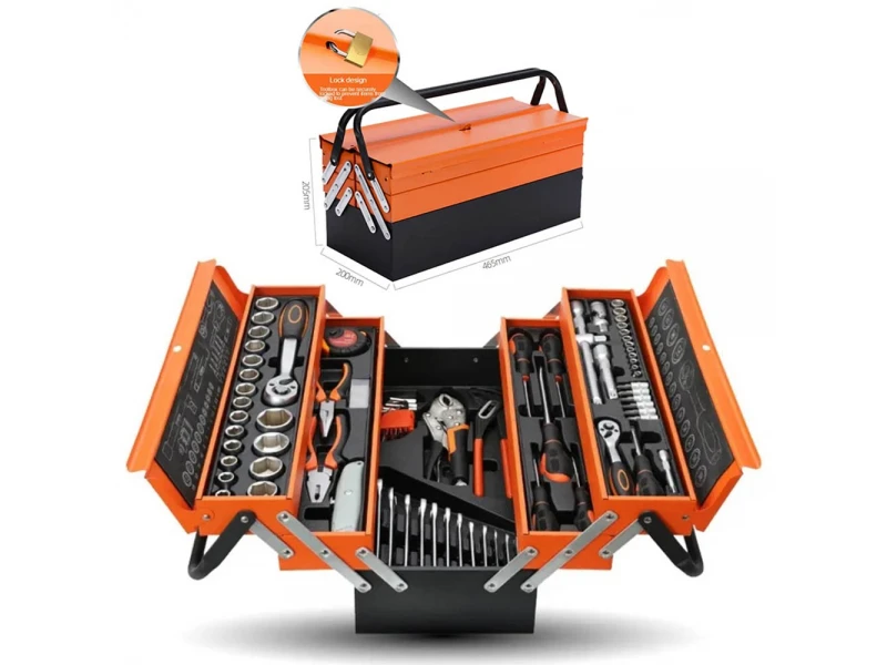 Μια στιβαρή μεταλλική θήκη που ανοίγει ώστε τα εργαλεία και οι προμήθειες σας να είναι πάντα κοντά σας. Το ΚΙΤ ΠΕΡΙΛΑΜΒΑΝΕΙ: 18 x Bits γαλλικού κλειδιού (1/2″) 10, 11, 12, 13, 14, 15, 16, 17, 18, 19, 20, 21, 22, 23, 24, 27, 30, 32 mm 1 x λαβή καστάνιας γρήγορης αποδέσμευσης (1/2″) Επέκταση 1 x 5″ (1/2″) 1 x 10″ καλώδιο επέκτασης με προσαρμογέα 3 δρόμων (1/2″) 1 x σύζευξη (1/2″) 12 x Sockets (1/4″): 4, 4,5, 5, 5,5, 6, 7, 8, 9, 10, 11, 12, 13mm 1 x λαβή καστάνιας γρήγορης αποδέσμευσης (1/4″) Επέκταση 1 x 3″ (1/4″) Υποδοχές κατσαβιδιού 6 τεμαχίων 1 x Πρίζα κατσαβίδι 1 x πένσα βελόνας 6″ 1 x πένσα συνδυασμού 7″ 1 x Roller blind 3 m 1 x μαχαίρι κοπής 10 x Ανταλλακτικές Λεπίδες 5 x κατσαβίδια: 5 x 75, 6 x 100, 8 x 150 mm, PH1 x 75 mm, PH2 x 100 mm 1 x πένσα αντλίας νερού 10″ 1 x πένσα 10″ 9 x Εξαγωνικό κλειδί 1,5-10 χλστ 12 x ανοιχτά κλειδιά - 6, 8, 9, 10, 11, 12, 13, 14, 15, 16, 17, 19 χλστ. 1x Μεταλλική βαλίτσα