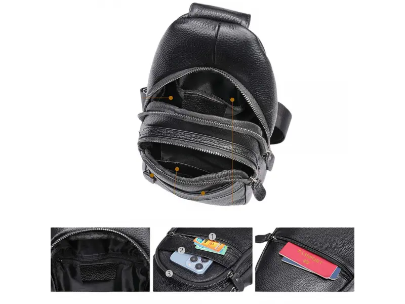 Δερμάτινη τσάντα υψηλής ποιότητας για άνδρες - Ανδρική τσάντα χιαστί από γνήσιο δέρμα. - Μία κύρια θήκη με φερμουάρ. Εσωτερική τσέπη με φερμουάρ. - Εσωτερική τσέπη χωρίς φερμουάρ. - Δύο μπροστινές τσέπες με φερμουάρ. - Μπροστινή τσέπη χωρίς φερμουάρ. - Πίσω τσέπη. Ρυθμιζόμενος ιμάντας ώμου.