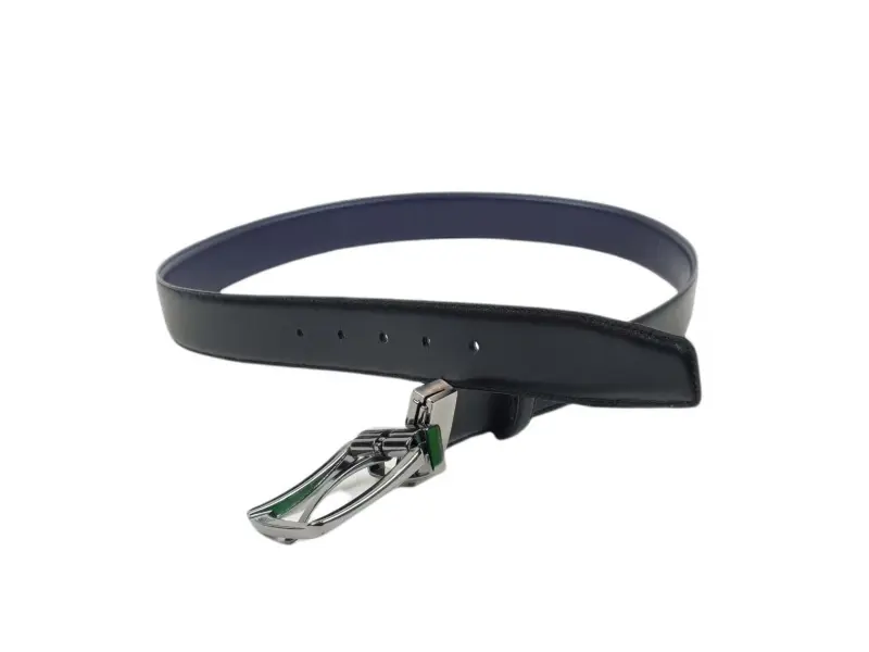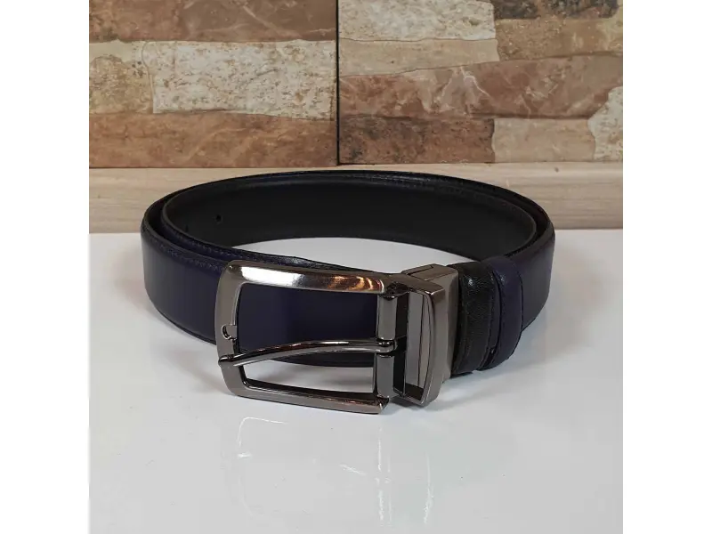 Ανδρική ζώνη διπλής όψης από γνήσιο δέρμα μοσχαριού σε μαύρο και μπλε χρώμα. Άνετη ζώνη με μεταλλική αγκράφα που γυρίζει εύκολα, κατάλληλη για τζιν και παντελόνια με δυνατότητα εύκολου σκισίματος.