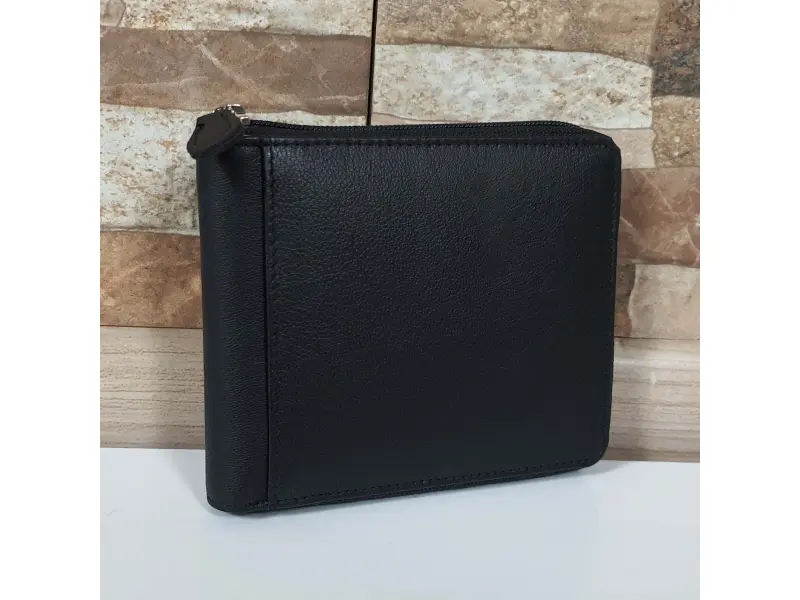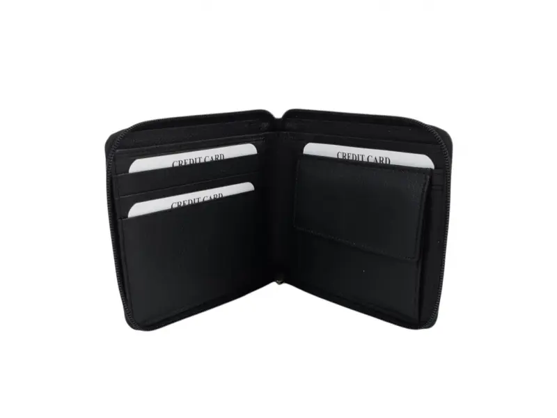 Άνετο ανδρικό πορτοφόλι από γνήσιο δέρμα μοσχαριού, με κλείσιμο με φερμουάρ. Μαύρο πορτοφόλι με εσωτερική θήκη για κέρματα, θήκες για κάρτες και θήκη για χαρτονομίσματα.