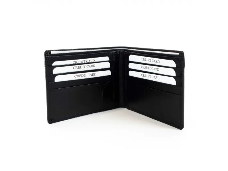 Υψηλής ποιότητας ανδρικό πορτοφόλι από γνήσιο δέρμα σε μαύρο χρώμα. Ανδρικό πορτοφόλι με επένδυση από γνήσιο δέρμα με βολικές θήκες για χαρτονομίσματα, κάρτες και έγγραφα, χωρίς θήκη για κέρματα.