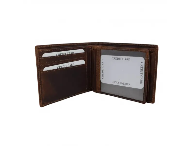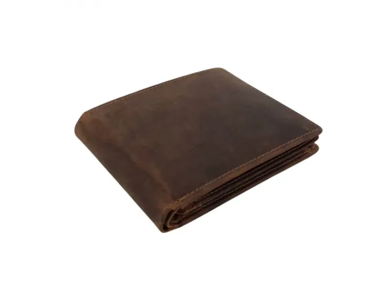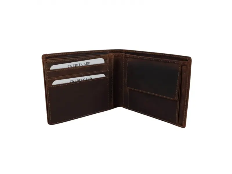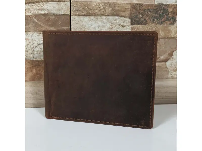 Άνετο ανδρικό πορτοφόλι από ειδικά επεξεργασμένο γνήσιο δέρμα κυνηγού. Καφέ πορτοφόλι με εσωτερική θήκη για κέρματα, θήκες για κάρτες και θήκη για χαρτονομίσματα.