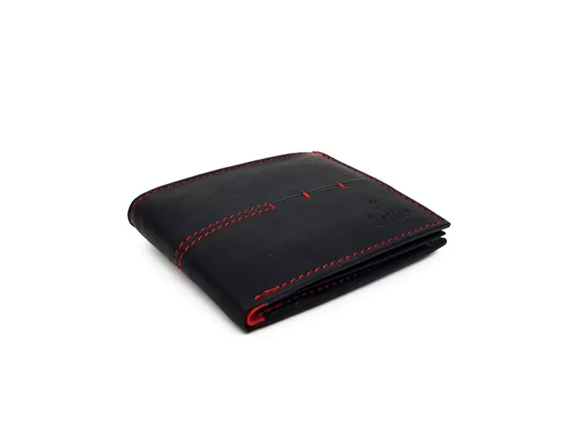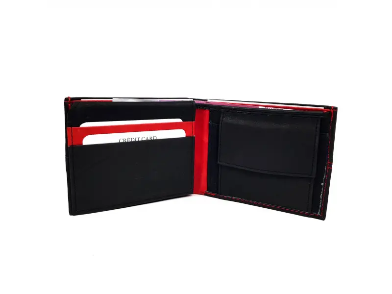 Υψηλής ποιότητας ανδρικό πορτοφόλι από γνήσιο δέρμα. Βολική διάταξη για επαγγελματικές κάρτες, τραπεζικές κάρτες και έγγραφα, χώρος για κέρματα. Κομψό πορτοφόλι σε μαύρο συνδυασμό με κόκκινο.