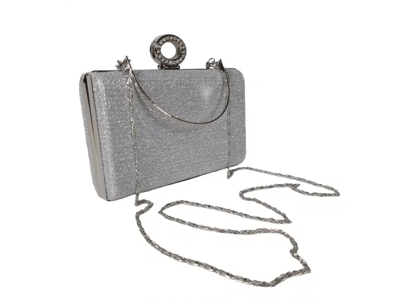 Ασημένια τσάντα χορού - Επίσημη τσάντα χειρός με μία θήκη. - Άνοιγμα και κλείσιμο με μηχανισμό. - Ασημένια μπορντούρα. - Λαβή για μεταφορά στο χέρι. - Λαβή τύπου μακριάς αλυσίδας.