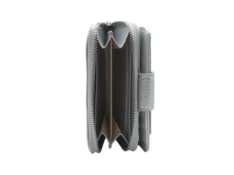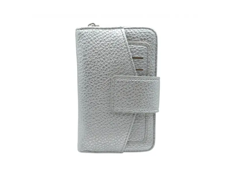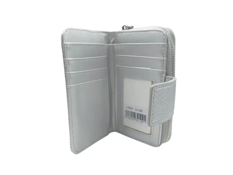 Ασημένιο γυναικείο πορτοφόλι με ενδιαφέρον σχέδιο από ποιοτικό συνθετικό δέρμα. Πρακτικό γυναικείο πορτοφόλι με βολικές θήκες για χαρτονομίσματα, κάρτες και κέρματα. Μικρό γυναικείο πορτοφόλι με κλείσιμο tic-tac.