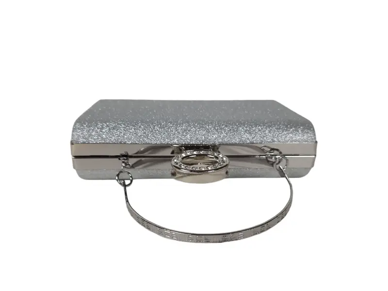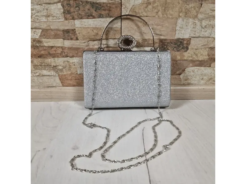 Βραδινή τσάντα με γκλίτερ - Επίσημη τσάντα χειρός με μία θήκη. - Άνοιγμα και κλείσιμο με μηχανισμό. - Ασημένια μπορντούρα. - Λαβή για μεταφορά στο χέρι. - Λαβή τύπου μακριάς αλυσίδας.