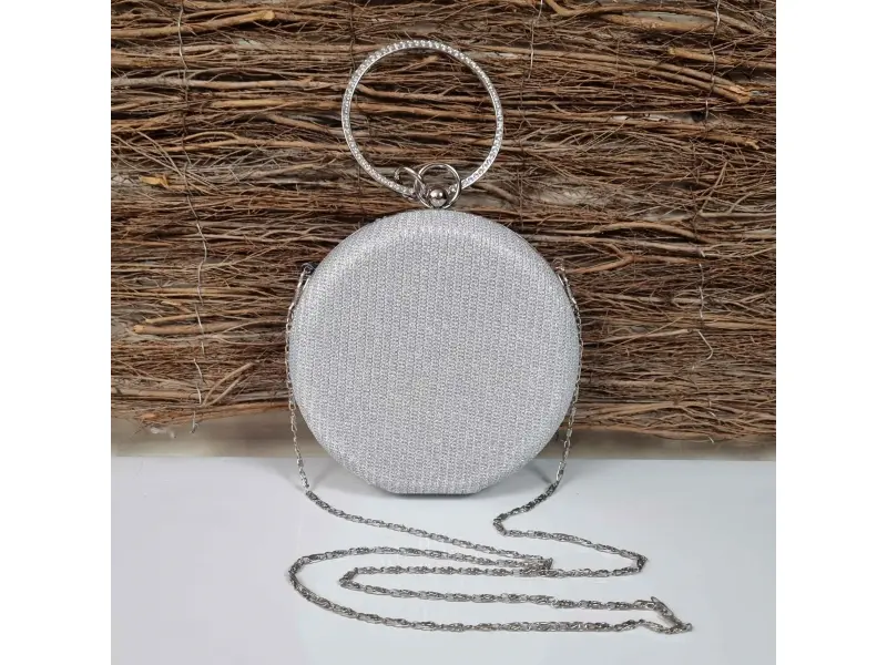 Λαμπερή στρογγυλή τσάντα σε ασημί χρώμα. Κομψή τσάντα με μία θήκη με ασημί τελείωμα, μακριά λαβή με αλυσίδα και επιπλέον λουράκι χειρός. Γυναικεία τσάντα κατάλληλη για χορό αποφοίτησης, γάμο ή ειδική εκδήλωση.