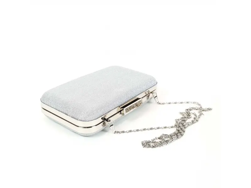 Κομψή μικρή ασημένια τσάντα με ασημί τελείωμα και αλυσίδα, ένα άνοιγμα θήκης με μηχανισμό. Μικρή ασημένια τσάντα κατάλληλη για επίσημη τσάντα, βραδινή τσάντα ή τσάντα για χορό.