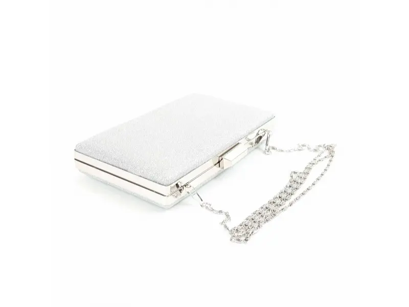 Επίσημη ασημένια τσάντα με ένα διαμέρισμα με ασημί τελείωμα και μακριά λαβή με αλυσίδα. Γυναικεία τσάντα κατάλληλη για χορό αποφοίτησης και επίσημες βραδιές.