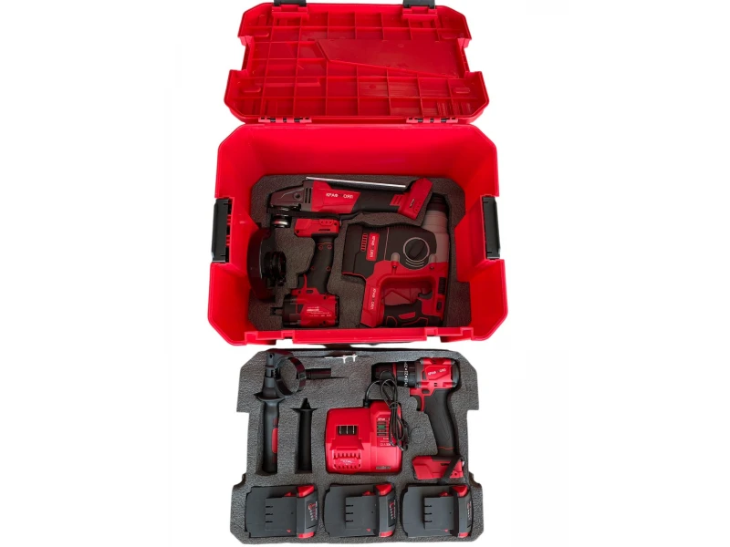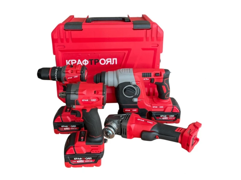 Αγοράστε ένα σετ 4 σε 1 KraftRoyal Red Mx Fuel 36V 8Ah - κρουστικό δράπανο/κρουστικό σφυρί, γωνιακός τροχός 125 mm, κλειδί και κατσαβίδι. Περιλαμβάνει 3 μπαταρίες, φορτιστή και θήκη. 24μηνη εγγύηση!