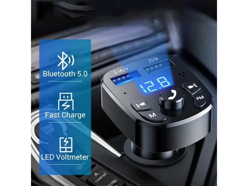 Προδιαγραφές: – Πομπός FM αυτοκινήτου – Λειτουργία Hands Free – αποδοχή, απόρριψη, επανάκληση και άλλες λειτουργίες - Ψηφιακή οθόνη - 2 τεμ. Θύρα USB για φόρτιση συσκευών μπαταρίας 3.1A και αναπαραγωγή μνήμης flash (flash). – Micro SD. – Σύστημα μείωσης θορύβου (CVC) κατά τη διάρκεια μιας κλήσης – Λειτουργία Bluetooth 5.0 – συμβατό με όλους τους τύπους τηλεφώνων – Εκπέμπει στην περιοχή 87,5-108MHz – Τροφοδοσία: 12/24V