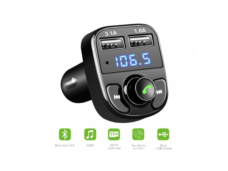 ΜΟΝΤΕΛΟ: X8 Χαρακτηριστικό: - Οθόνη: LCD - Μορφή υποστήριξης: Mp3 - Ραδιόφωνο FM - Λειτουργία BLUETOOTH: εμβέλεια έως 5 μέτρα - Λειτουργία HANDSFREE: κλήσεις hands-free - Θύρα USB 1: για φόρτιση άλλης συσκευής - Είσοδος USB 2: για μνήμη flash - Είσοδος κάρτας μνήμης Micro SD - Θέση: άκαμπτη - Τροφοδοσία: από τον αναπτήρα του αυτοκινήτου. - Εξαιρετικά εύκολο στη χρήση - αφαιρέστε τον αναπτήρα από το αυτοκίνητό σας και εγκαταστήστε τον διαμορφωτή και απολαύστε τη μουσική της επιλογής σας.