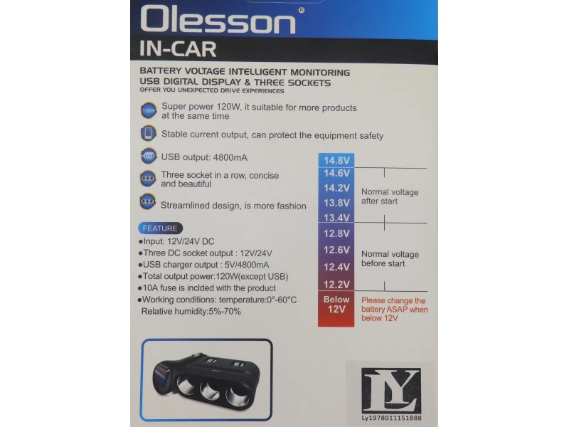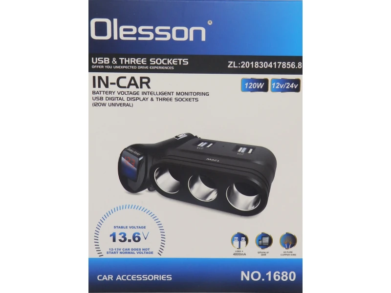 Βύσμα αναπτήρα Olesson 1680, 3 υποδοχές, 4 USB, ενσωματωμένο