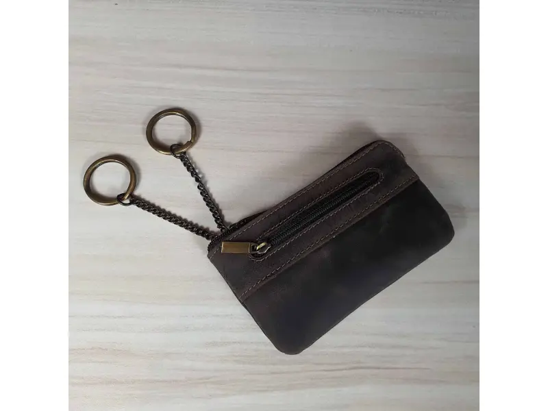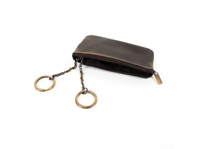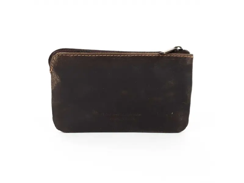 Θήκη κλειδιών υψηλής ποιότητας - πορτοφόλι από γνήσιο δέρμα μοσχαριού - φινίρισμα κυνηγού. Συμπαγές πορτοφόλι με κύρια θήκη με φερμουάρ, χώρο για χαρτονομίσματα, κέρματα και δύο μπρελόκ, μπροστινή τσέπη με φερμουάρ.