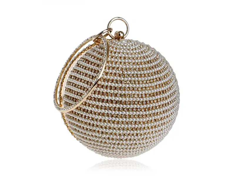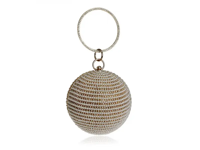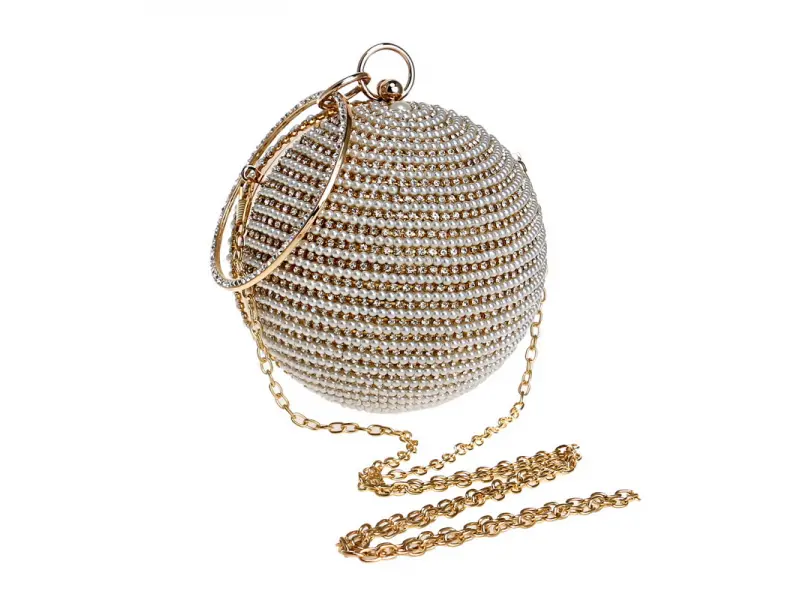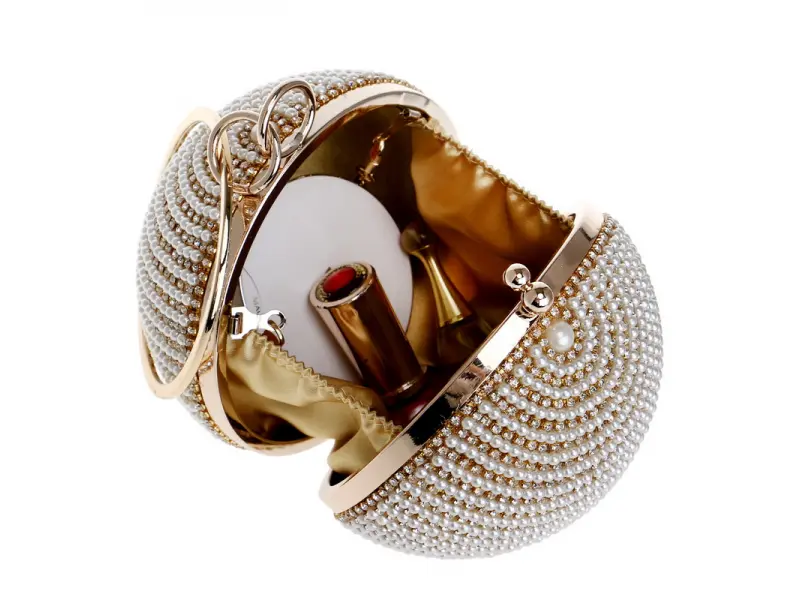 Τσάντα γάμου σε σφαιρικό σχήμα - Επίσημη τσάντα χειρός με μία θήκη. - Άνοιγμα και κλείσιμο με μηχανισμό. - Χρυσό περίγραμμα. - Λαβή για μεταφορά στο χέρι. - Λαβή τύπου μακριάς αλυσίδας.