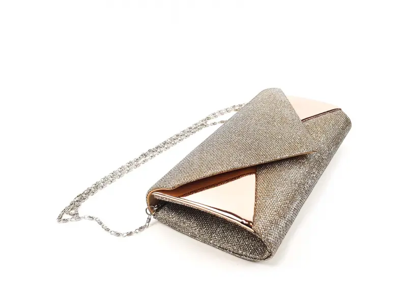 Κομψή μικρή τσάντα κατάλληλη για χορό αποφοίτησης, επίσημες βραδιές ή απλώς ως βραδινή τσάντα. Χρυσή τσάντα clutch, βραδινή τσάντα με μακριά ασημένια αλυσίδα και μία μεγάλη θήκη.