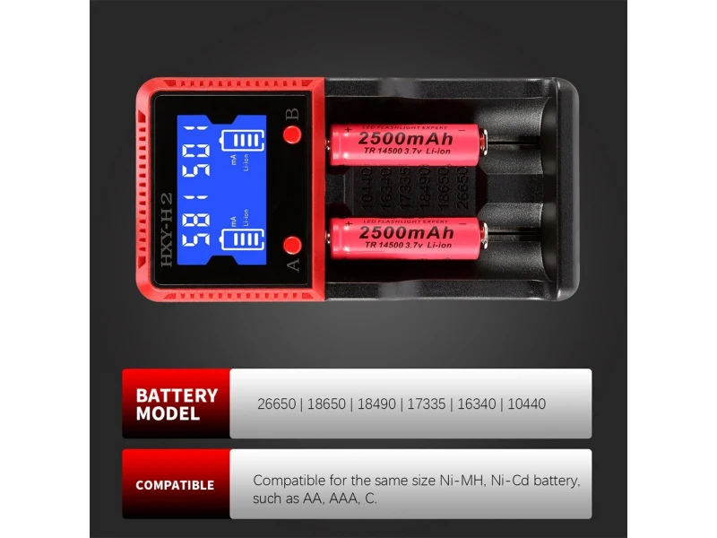 Ο υψηλής ποιότητας φορτιστής διπλού Li-on είναι κατάλληλος για φόρτιση μπαταριών 26650, 18650, 18490, 17335, 16340 (RCR123), 10440, Ni-MH / Ni-Cd.