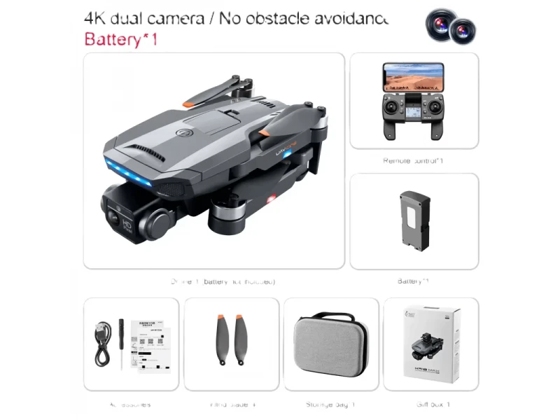 Η συσκευασία περιλαμβάνει:1 x Drone1 x Τηλεχειριστήριο με θήκη smartphone1 x Μπαταρία σώματος4 x Έλικες1 x USB καλώδιο φόρτισης1 x Κατσαβίδι1 x Τσάντα αποθήκευσης – μεταφοράςΟδηγίες χρήσης στα ΑγγλικάΤεχνολογία 2.4GHz: Χωρίς παρεμβολές4 κανάλιαΑνάλυση: HD 4KΑπόσταση μετάδοσης εικόνας 5G: περίπου 1200 μ. WIFI:5G Wi-Fi(802.11ac)4 κανάλια: Άνοδος, κάθοδος, εμπρός, πίσω, αριστερή πτήση, δεξιά πτήσηΣυχνότητα λειτουργίας χειριστηρίου: 2.4GHZΦώτα LEDΧρόνος πτήσης: 10 λεπτάΚατάλληλο για ηλικίες από 14 και άνω+Λειτουργία συντήρησης σταθερού ύψους και υψομέτρου, αποφυγής εμποδίων τριών πλευρών υπέρυθρης επαγωγής, τοποθέτησης φακού διπλής οπτικής ροής, κινητήρα χωρίς ψήκτρες και σταθερής πτήσηςΚάμερα 4K, μπορεί να ελέγξει τη γωνία του φακού πάνω-κάτω από το τηλεχειριστήριο και μπορεί να πραγματοποιήσει τη λειτουργία λήψης 150° προς τα πάνωΜε τη λειτουργία σύνδεσης WiFi, μπορεί να συνδεθεί με προγράμματα εφαρμογών και συστήματα APP και μπορεί να τραβήξει φωτογραφίες, βίντεο και να μεταδώσει φωτογραφίες σε πραγματικό χρόνο μέσω κάμερας κινητού τηλεφώνουΠτήση τροχιάς: Μέσω smartphone, μπορείτε να σχεδιάσετε την τροχιά πτήσης και να πετάξετε το drone σύμφωνα με αυτήΛειτουργία headless mode, δεν χρειάζεται να ρυθμίσετε τη θέση του αεροσκάφους πριν από την πτήσηGesture photo/video. Λήψη φωτογραφίας ή βίντεο μέσω χειρονομιών (σε απόσταση 3 μέτρων)Μοτέρ χωρίς ψήκτρες, πιο σταθερή πτήση και πιο βολικό έλεγχοΤα φώτα LED κάνουν την πτήση πιο θεαματική, ειδικά στο σκοτάδιΛειτουργίες: Περιστροφή πάνω/κάτω/εμπρός/πίσω/αριστερά/δεξιά, πλάγια πτήση, φως LED, λειτουργία χωρίς κεφαλή, αυτόματη επιστροφή με ένα κουμπί, λειτουργία διατήρησης υψομέτρου, wifi fpv (διπλός φακός με λειτουργία εναλλαγής διπλού φακού)Περίβλημα κατασκευασμένο από υψηλής αντοχής και ανθεκτικά πλαστικά φιλικά προς το περιβάλλονΑναδιπλούμενος σχεδιασμός​