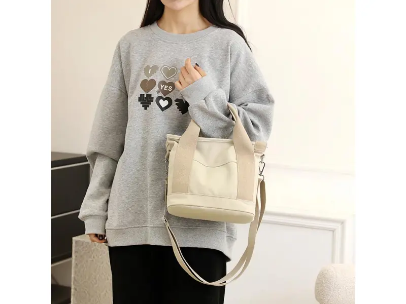 Φρέσκια τσάντα με μακριά λαβή - Υφασμάτινη τσάντα χειρός. - Μία κύρια θήκη με φερμουάρ. - Μπροστινή τσέπη χωρίς φερμουάρ. - Εσωτερικό διαμέρισμα. - Θήκη για τηλέφωνο και έγγραφα. - Ρυθμιζόμενη, μακριά λαβή.
