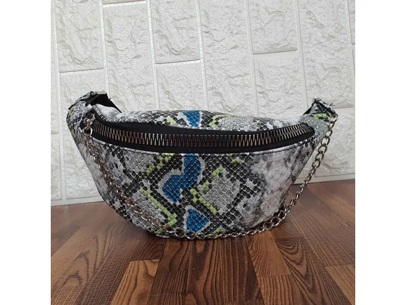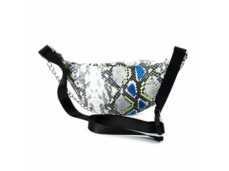 Κομψή γυναικεία τσάντα χιαστί από οικολογικό δέρμα με τύπωμα φιδιού. Τσάντα χιαστί σε σχήμα τσάντας sling με μία μεγάλη θήκη που κλείνει με ασημί φερμουάρ και ασημένια αλυσίδα. Ρυθμιζόμενη ζώνη από πολυεστέρα.