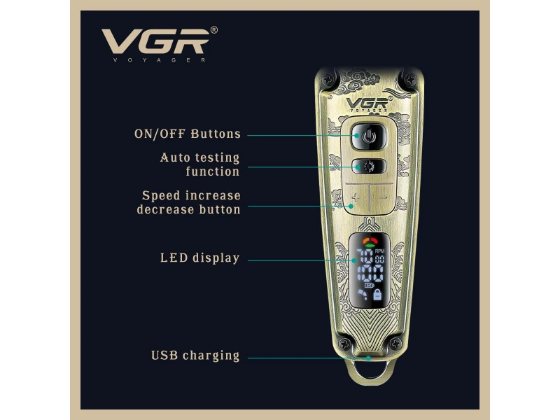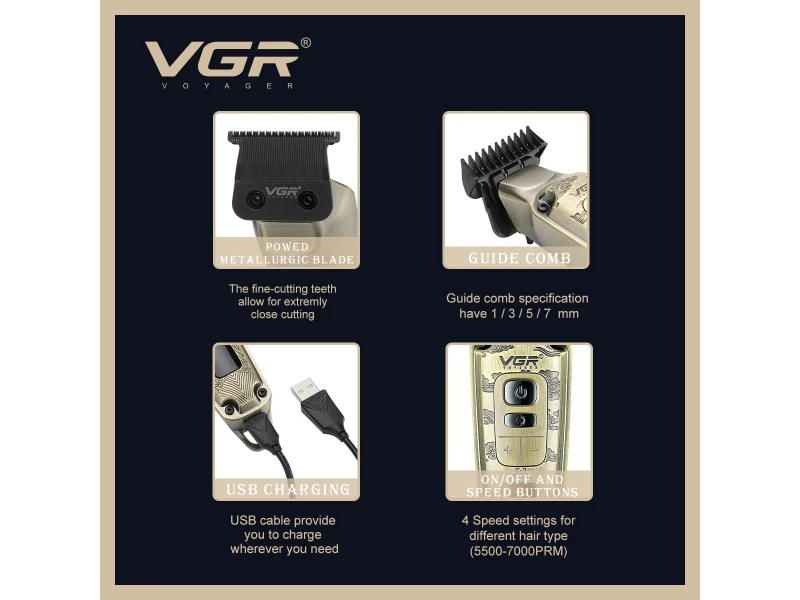 Η κουρευτική μηχανή VGR V-901 Professional έχει μεταλλικό σώμα που είναι ανθεκτικό και σταθερό και προσθέτει μια νότα ποιότητας στη διαδικασία κοπής. Μπορείτε να χρησιμοποιήσετε διαφορετικές ταχύτητες για να αλλάξετε την ταχύτητα της κουρευτικής τρίχας (5500/6000/6500/7000), γεγονός που κάνει την εργασία πιο βολική.