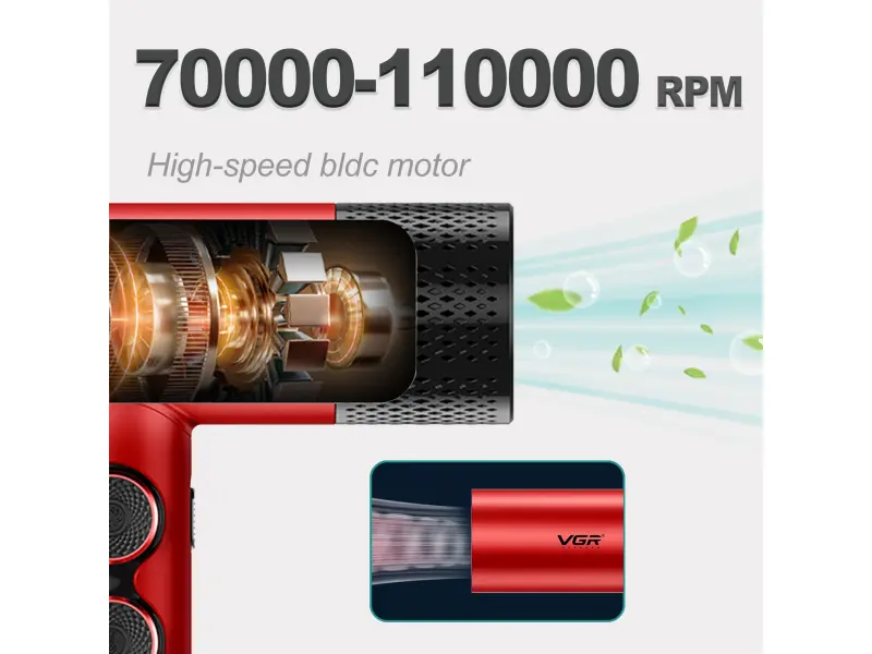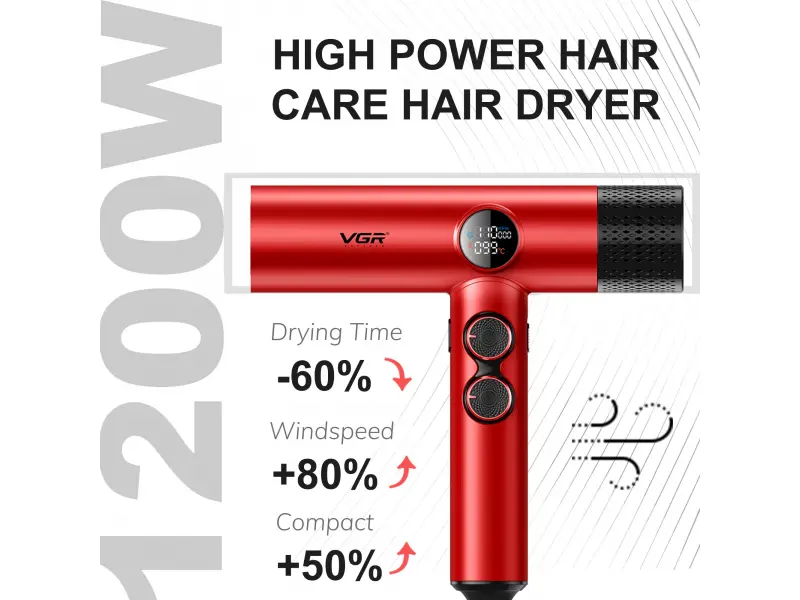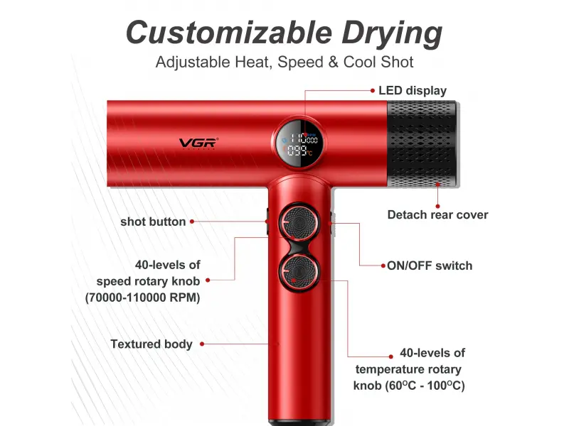 Επαγγελματικό πιστολάκι μαλλιών VGR-401 σε κόκκινο χρώμα με κινητήρα BLDC και αρνητικά ιόντα – για γρήγορο, απαλό και αθόρυβο στέγνωμα μαλλιών. Οθόνη LED για εύκολο χειρισμό, αντιστατικό αποτέλεσμα και φυσική λάμψη. Επιλέξτε ποιότητα και άνεση για την καθημερινή σας περιποίηση!