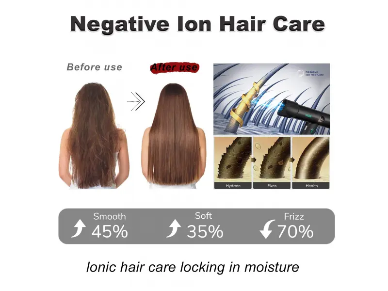 Χάρη στο προηγμένο σύστημα αρνητικών ιόντων , θα απολαύσετε λεία, απαλά και ζωντανά μαλλιά χωρίς στατικό ηλεκτρισμό και φριζάρισμα. Το χτένισμά σας θα δείχνει φυσικά λαμπερό και υγιές κάθε μέρα!