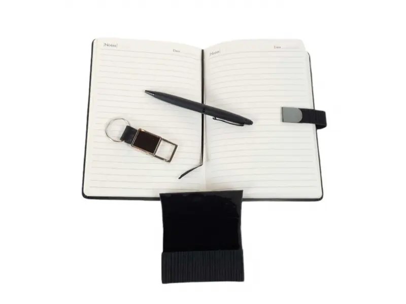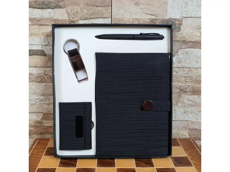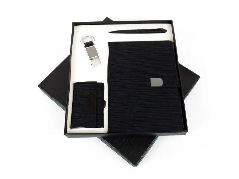 Επαγγελματικό σετ σε μαύρο χρώμα που περιέχει στυλό, σημειωματάριο, μπρελόκ και επαγγελματική κάρτα από ποιοτικό ύφασμα.
