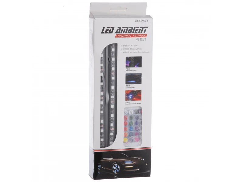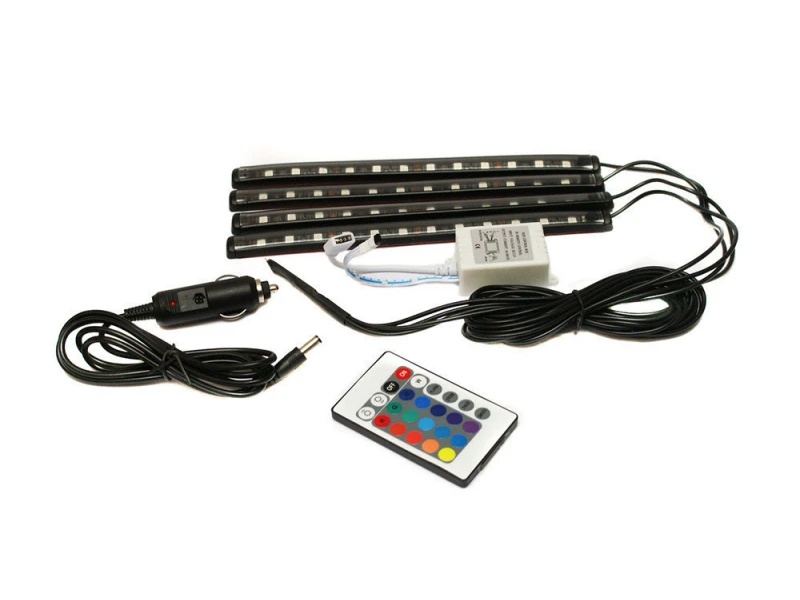 Εσωτερικός φωτισμός led για αυτοκίνητο, φωτισμός κουπέ. Εκπέμπουν απαλό φως. Κατάλληλο για διακοσμητικό φωτισμό. Χαρακτηριστικά: ⇒ Αριθμός διόδων: 4 x 18 LED SMD5050 ⇒ Απαλό φως, δεν ερεθίζει τα μάτια ⇒ Μήκος λωρίδων: 30 cm ⇒ Χρώμα φωτός: περισσότερα από 12 χρώματα (επιλογή τηλεχειριστηρίου) ⇒ Κουμπί: ON / OFF ⇒ Πολύ χαμηλή κατανάλωση ενέργειας ⇒ Εξαιρετικά μεγάλη διάρκεια ζωής ⇒ Δεν υπάρχει ακτινοβολία UV ή IR στη δέσμη φωτός ⇒ Τροφοδοτικό 12V
