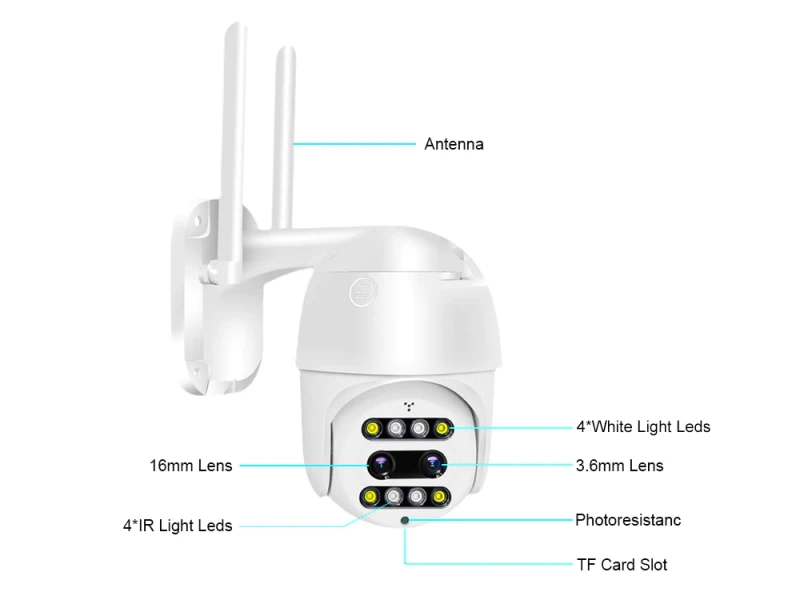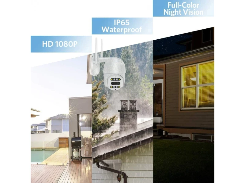 Η κάμερα Wifi Dual Lens PTZ είναι αδιάβροχη και κατάλληλη για εξωτερικές συνθήκες, μπορεί να ρυθμιστεί και να εγκατασταθεί σε λίγα λεπτά χωρίς την ανάγκη πρόσθετων συσκευών ή καλωδίων. Η προστασία για αντοχή στο νερό είναι IP66.