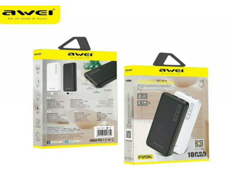 Φορητή εξωτερική μπαταρία Awei, Μοντέλο P28K, Χωρητικότητα 10000mAh, Σούπερ γρήγορη φόρτιση, 2 θύρες USB, Power Bank, MicroUSB, USB 2.1A, ενδείξεις LED.