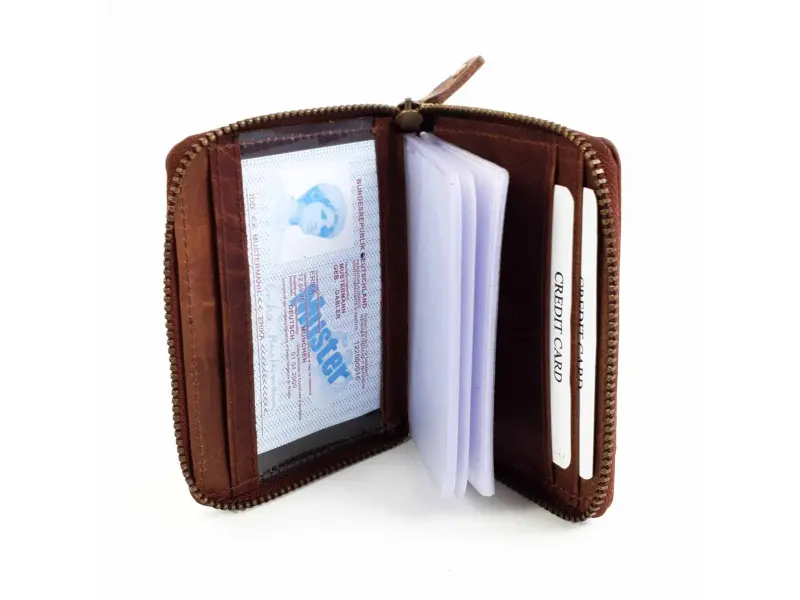 Υψηλής ποιότητας καφέ θήκη επαγγελματικών καρτών με φερμουάρ. Βολικό μοντέλο θήκης επαγγελματικών καρτών με υποδοχές καρτών και χώρο για επαγγελματικές κάρτες. Θήκη επαγγελματικών καρτών από γνήσιο δέρμα με προστασία RFID.