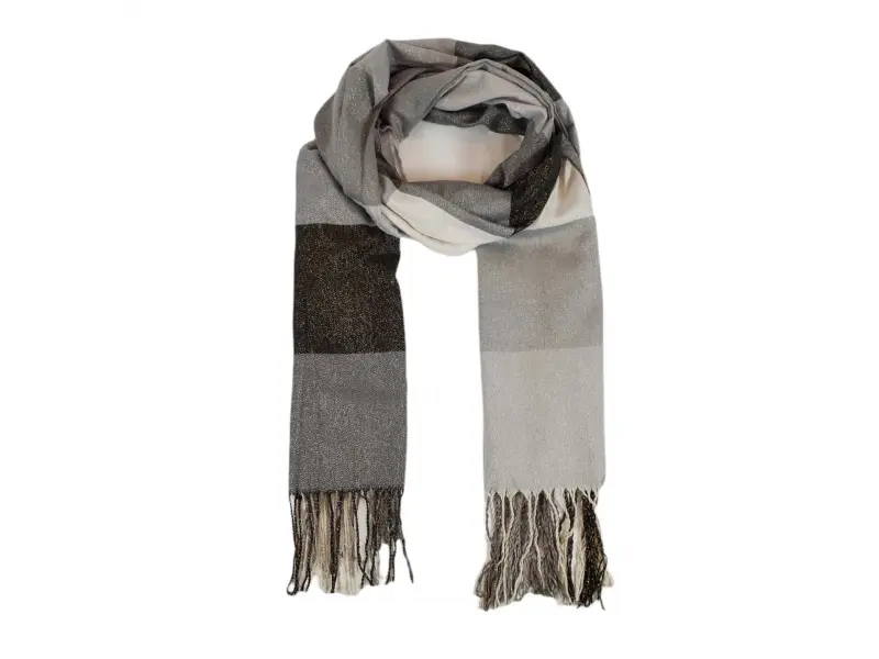 Μαλακό και άνετο γυναικείο φουλάρι με έναν ενδιαφέροντα συνδυασμό χρωμάτων. Το φουλάρι είναι κατασκευασμένο από συνδυασμό 70% βαμβακιού και 30% μεταλλικού νήματος.
