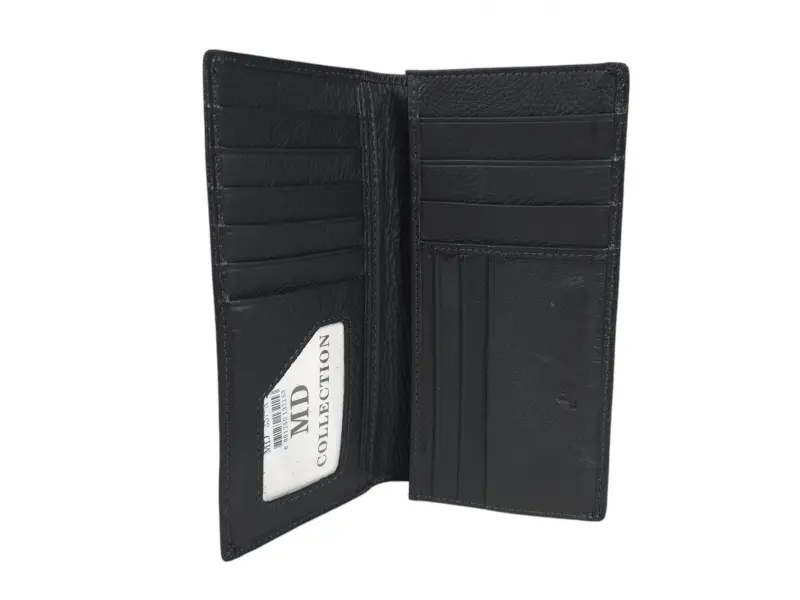 Κάθετο ανδρικό πορτοφόλι από ποιοτικό γνήσιο δέρμα. Μεγάλο πορτοφόλι με θήκες για χαρτονομίσματα, υποδοχές για προσωπικά έγγραφα. Άνετο ανδρικό πορτοφόλι με ενδιαφέρον σχέδιο.