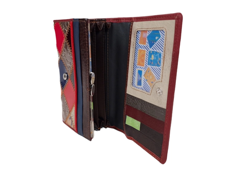 Γυναικείο πορτοφόλι υψηλής ποιότητας από γνήσιο δέρμα. Μεγάλο πολύχρωμο πορτοφόλι με θήκες για χαρτονομίσματα, θήκες για κάρτες και ταυτότητες, εσωτερική θήκη για κέρματα με κλιπ και πίσω τσέπη.