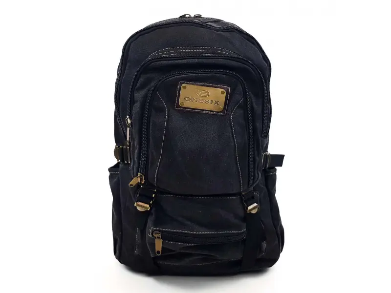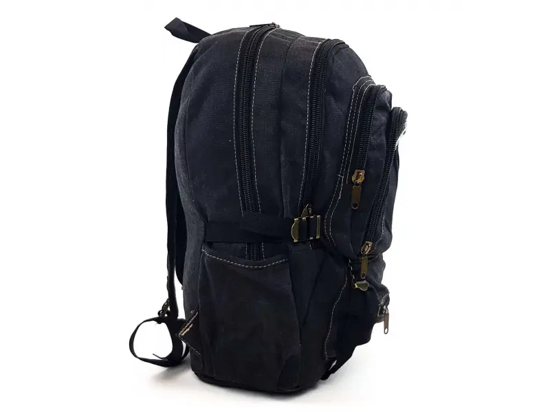 Εξαιρετικά στιβαρό μαύρο σακίδιο πλάτης από καμβά, πολλές θήκες, εύκολα στο άνοιγμα και κλείσιμο μεταλλικά φερμουάρ, θήκες για μπουκάλια, ρυθμιζόμενοι ιμάντες που συμπιέζουν τον όγκο του σακιδίου. Πολύ μεγάλο και στιβαρό σακίδιο πλάτης κατάλληλο για εκδρομές, κυνήγι και ψάρεμα, ακόμη και για το σχολείο. Ανθεκτική αδιάβροχη εσωτερική επένδυση.
