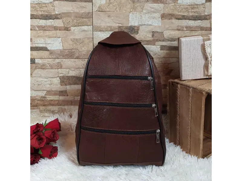 Γυναικείο σακίδιο πλάτης υψηλής ποιότητας - τσάντα από γνήσιο δέρμα αρνιού. Καφέ σακίδιο πλάτης με μία κύρια θήκη με φερμουάρ, μια μικρή εσωτερική τσέπη με φερμουάρ και τρεις μπροστινές τσέπες με φερμουάρ. Μεγάλο σακίδιο πλάτης με άνετα ρυθμιζόμενα λουράκια που μπορούν να κλείσουν με φερμουάρ και δυνατότητα να φορεθεί ως τσάντα.