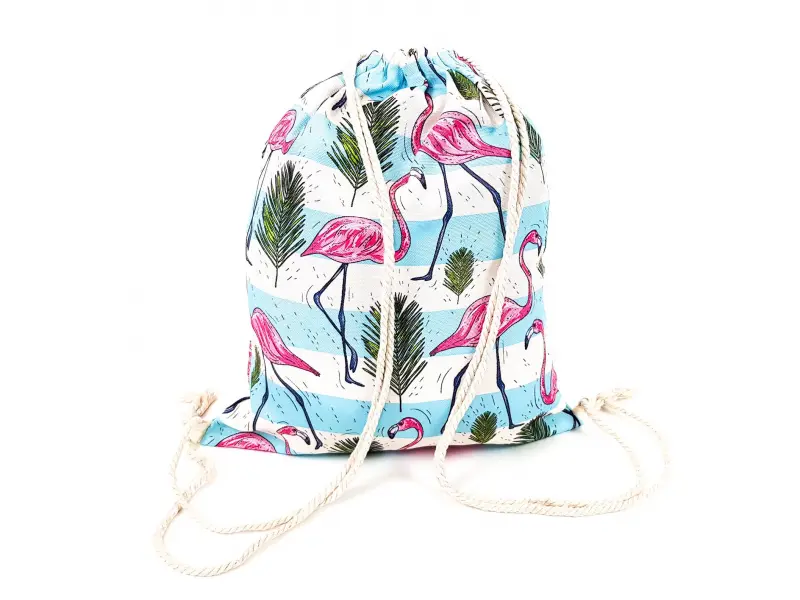 Τσάντα Fresh με λευκές και μπλε ρίγες, φλαμίνγκο και φύλλα. Σακίδιο πλάτης τύπου σάκου με μία θήκη, που κλείνει με κορδόνια. Τσάντα κατάλληλη για κορίτσια, για καθημερινή χρήση ή για την παραλία.
