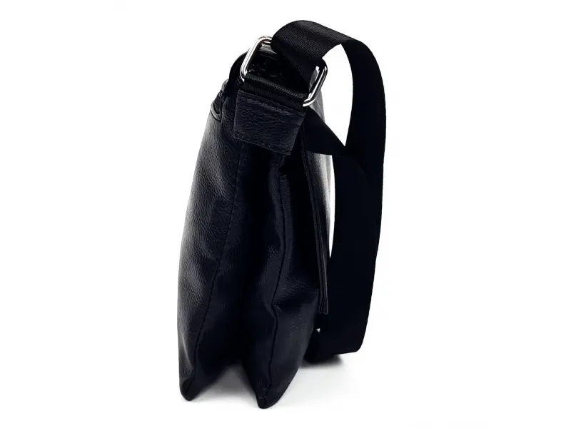 Μαύρη ανδρική τσάντα από συνθετικό δέρμα με καπάκι. Τσάντα με μεγάλη θήκη και πίσω τσέπη, δύο εσωτερικά χωρίσματα και τσέπες, εύκολα ρυθμιζόμενο μακρύ λουράκι ώμου από πολυεστέρα.