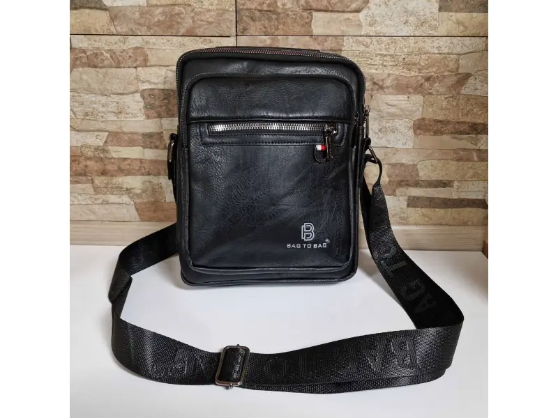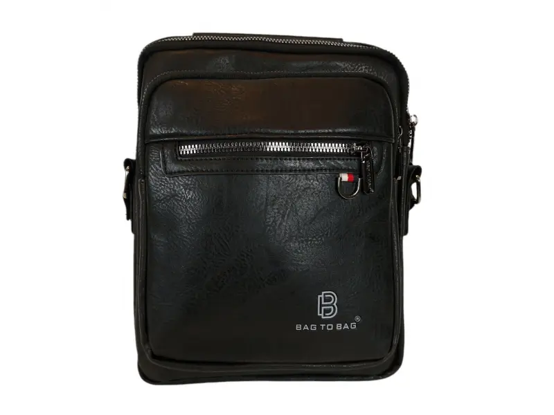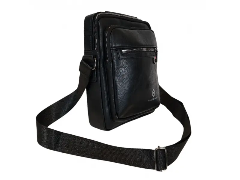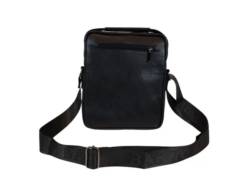 Ανδρική τσάντα από ποιοτικό οικολογικό δέρμα σε μαύρο χρώμα. Άνετη τσάντα με μία κύρια θήκη με φερμουάρ, μια μικρή εσωτερική τσέπη με φερμουάρ, δύο μπροστινές τσέπες με φερμουάρ και μια πίσω τσέπη με φερμουάρ. Ανθεκτική ανδρική τσάντα με άνετη λαβή για μεταφορά στο χέρι και ρυθμιζόμενη μακριά λαβή.