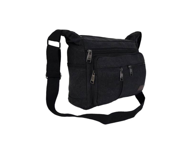 Μαύρη ανδρική τσάντα από καμβά - Ανδρική τσάντα από ανθεκτικό και αδιάβροχο ύφασμα - μουσαμά. - Μία κύρια θήκη με φερμουάρ. - Μικρή εσωτερική τσέπη με φερμουάρ. - Τέσσερις μπροστινές τσέπες με φερμουάρ. - Μεγάλη πίσω τσέπη με φερμουάρ. Δύο πλαϊνές τσέπες. - Μακριά ρυθμιζόμενη λαβή.