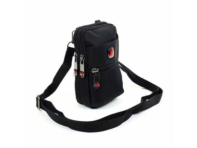 Μικρή ανδρική τσάντα από ύφασμα υψηλής ποιότητας. Ανδρική τσάντα με δύο κύριες θήκες, δύο μπροστινές τσέπες με φερμουάρ και χωρίς φερμουάρ. Ανθεκτική τσάντα με μακριά ρυθμιζόμενη λαβή και δυνατότητα κρέμασης και στερέωσης με ζώνη.