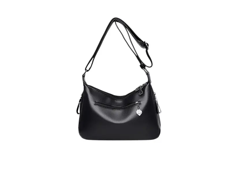 Μεσαίου μεγέθους τσάντα χειρός από ποιοτικό οικολογικό δέρμα. Μαύρη τσάντα χειρός με πολλές θήκες και ρυθμιζόμενη μακριά λαβή. Καθημερινή τσάντα χειρός με ενδιαφέρον σχέδιο.