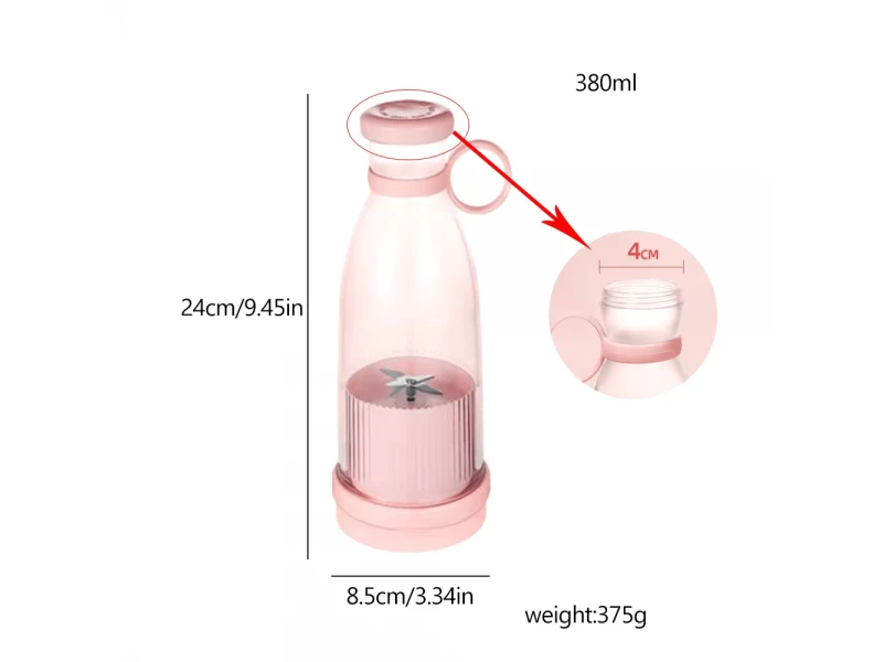 Φορητό Ηλεκτρικό Μπλέντερ 420ml Επαναφορτιζόμενο με USBΑυτός ο μίνι αποχυμωτής smoothie είναι τέλειος για την παρασκευή smoothies μίας μερίδας με θρεπτικά συστατικά, σέικ, μείγματα χυμών, μείγματα φρούτων, χυμούς λαχανικών, παιδικές τροφές και άλλες τροφές. Μπορείτε να πίνετε θρεπτικούς χυμούς, σέικ ή smoothies οποιαδήποτε στιγμή, οπουδήποτε.【Εύκολο να φτιάξεις υγιεινά Smoothies】 Πρόκειται για μια ισχυρή μίνι φορητή μηχανή αποχυμωτή υψηλής ταχύτητας με 2 εξαιρετικά κοφτερές λεπίδες από ανοξείδωτο χάλυβα. Εξοπλισμένο με ισχυρό μοτέρ και λεπίδες από ανοξείδωτο χάλυβα με κοφτερές λεπίδες, το μίνι μπλέντερ είναι γρήγορο και μακράς διαρκείας για να αποκτήσετε ένα smoothie πλούσιο σε θρεπτικά συστατικά σε μόλις 60 δευτερόλεπτα. 【Φόρτιση USB και φορητό】Το μπλέντερ φρέσκων χυμών USB διαθέτει ενσωματωμένη επαναφορτιζόμενη μπαταρία 1200mh. Μπορεί να χωρέσει περίπου. Η πλήρης φόρτιση διαρκεί 2-3 ώρες και μπορεί να παράγει έως και 10-15 φλιτζάνια χυμού. Η mini smoothie maker μπορεί να φορτιστεί για 2-3 ώρες μέσω οποιασδήποτε θύρας USB και μπορεί να καταναλωθεί στην εφαρμογή και στο σπίτι, στο γραφείο, στο γυμναστήριο, στα ταξίδια ή σε άλλες υπαίθριες δραστηριότητες. 【Καθαρό και πρακτικό】 Ο ηλεκτρικός αναδευτήρας καθαρίζεται πολύ εύκολα. Για να καθαρίσετε, απλώς ρίξτε λίγο νερό και μια προαιρετική σταγόνα σαπουνιού στο μπλέντερ και πρέπει να πατήσετε δύο φορές το κουμπί ενεργοποίησης/απενεργοποίησης για να ξεκινήσετε τον αυτόματο καθαρισμό μέχρι να καθαρίσει. Δεν χρειάζεται να αποσυναρμολογήσετε και να καθαρίσετε ξανά. 【Λίστα συσκευασίας】1 x φορητός αποχυμωτής 1 x καλώδιο δεδομένων USB Κατασκευασμένο από υψηλής ποιότητας υλικό PP ποιότητας τροφίμων, φρέσκο και εύκολο στο καθάρισμα, δεν μυρίζει εύκολα. Ο μίνι αποχυμωτής μας είναι συμπαγής, ώστε να μπορείτε να τον μεταφέρετε οπουδήποτε με το κύπελλο αποχυμωτή 300 ml για να ταιριάζει στις προσωπικές σας ανάγκες.Διαστάσεις: 22.5 (Υ) x 4.5 (Π πώματος) x 7.5 cm (Π βάσης)