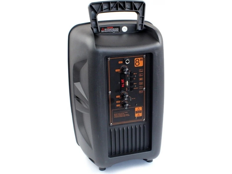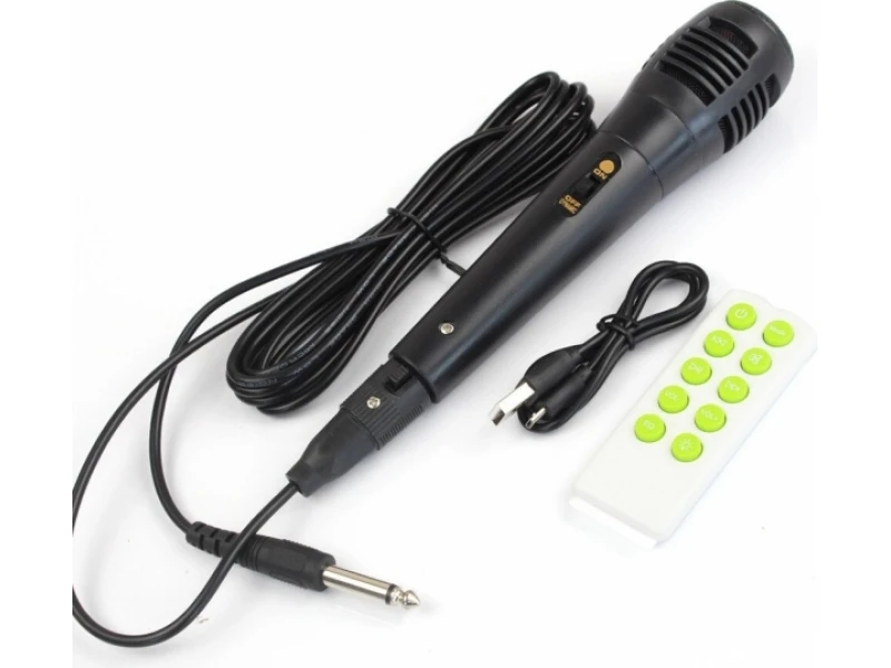 Το σετ περιέχει: 1 τεμ. Στήλη καραόκε μπαταρίας 1 τεμ. Ενσύρματο μικρόφωνο 1 τεμ. Καλώδιο τροφοδοσίας συστήματος καραόκε – 220V 1 τεμ. Τηλεχειριστήριο. Τεχνικά χαρακτηριστικά: Ισχύς: γούφερ 8 ιντσών Στάθμη ήχου: 85 dB Συχνότητα: 100Hz – 20kHz Τροφοδοσία: 220V. Προσδιορισμός: Ηχείο καραόκε με επαναφορτιζόμενη μπαταρία (επαναφορτίζει από 220V) COLOR MUSIC – ενσωματωμένα εφέ φωτός, με κουμπί ενεργοποίησης και απενεργοποίησης Λειτουργία BLUETOOTH – σύζευξη της στήλης με GSM, υπολογιστή, φορητό υπολογιστή και ασύρματη ακρόαση της αγαπημένης σας μουσικής – πάνω από 10 μέτρα Δέκτης FM - ΡΑΔΙΟΦΩΝΟ Τηλεχειριστήριο (περιλαμβάνεται) Δυνατότητα ανεξάρτητης χρήσης χωρίς σύνδεση με υπολογιστή μέσω: Υποδοχή κάρτας μνήμης SD/MMC/MMS την υποδοχή της μονάδας flash USB Είσοδος AUX από εξωτερική συσκευή (υπολογιστής, GSM, Ipod, PSP) ΟΘΟΝΗ LED Είσοδος για 1 μικρόφωνο Ενσύρματο μικρόφωνο 1 τεμάχιο - περιλαμβάνεται στο σετ Βολική αναδιπλούμενη λαβή - για εύκολη μεταφορά του ηχείου Διαστάσεις: w/h/d – 24 / 36,5 / 20 cm