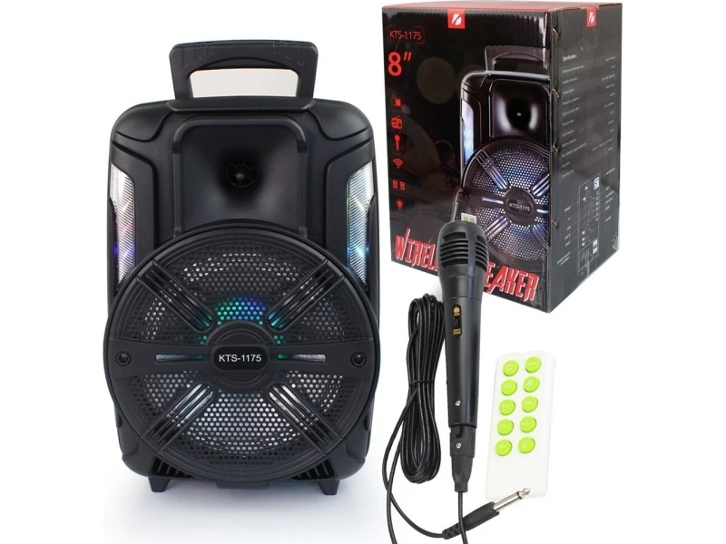 Ηχείο καραόκε με επαναφορτιζόμενη μπαταρία. Ενσωματωμένα εφέ φωτισμού, με κουμπί ενεργοποίησης και απενεργοποίησης. Φορητό ηχείο καραόκε KTS-1175 8" με μικρόφωνο