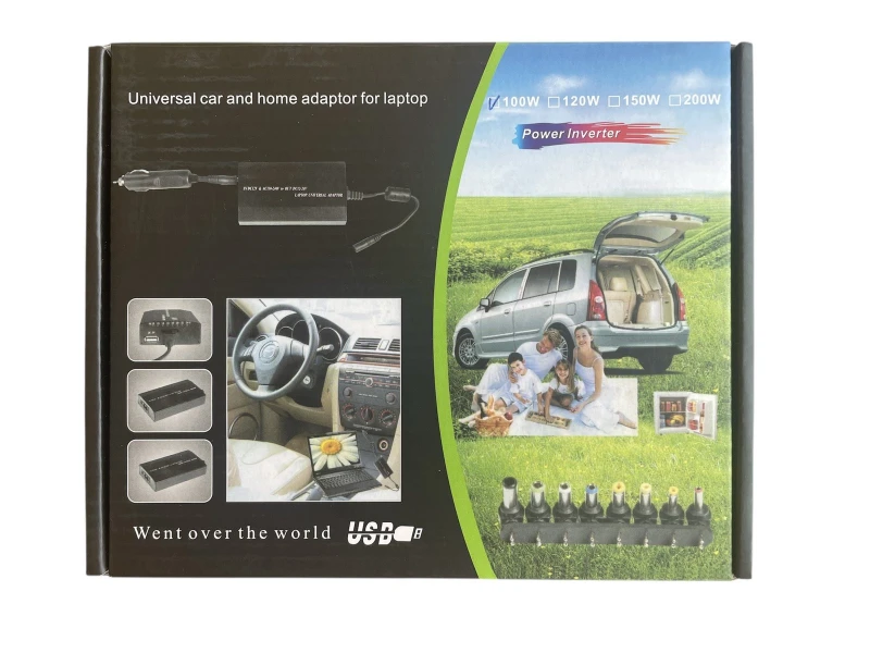 Πολυλειτουργικός φορτιστής 100W με θύρα USB, 8 εναλλάξιμα βύσματα και προστασία υπερφόρτωσης. Λειτουργεί με 12V DC και 110–240V AC - ιδανικός για το σπίτι και το αυτοκίνητο.