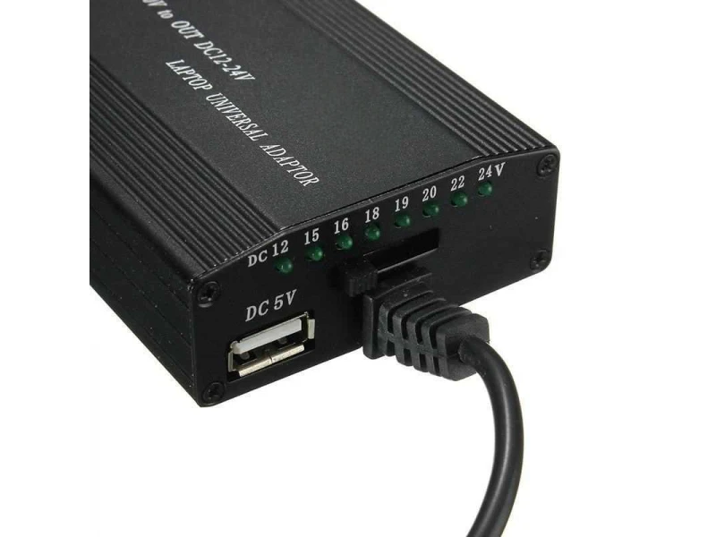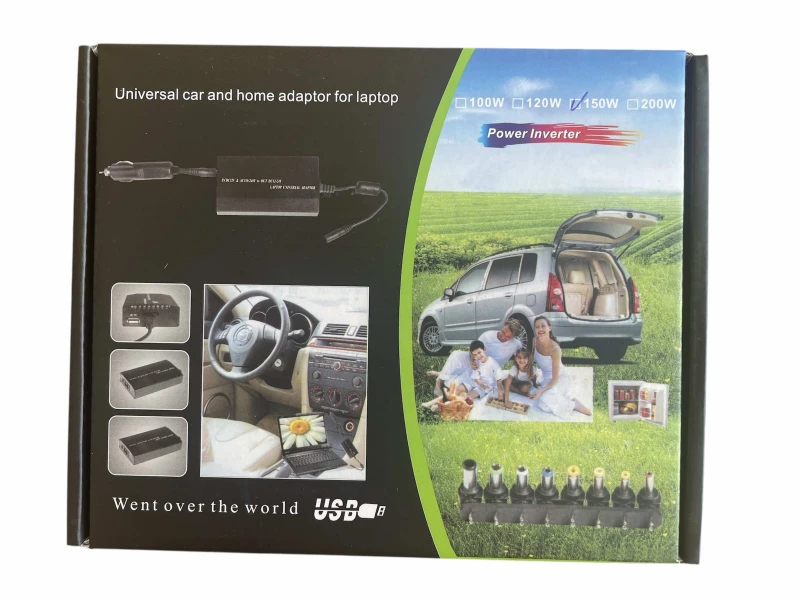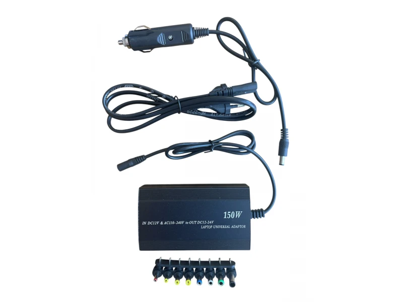 Πολυλειτουργικός φορτιστής 150W με θύρα USB, 8 εναλλάξιμα βύσματα και προστασία υπερφόρτωσης. Λειτουργεί με 12V DC και 110–240V AC - ιδανικός για το σπίτι και το αυτοκίνητο.