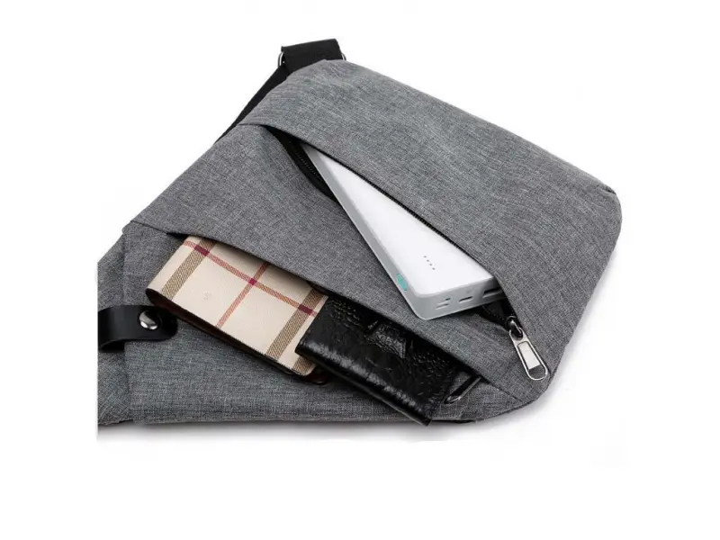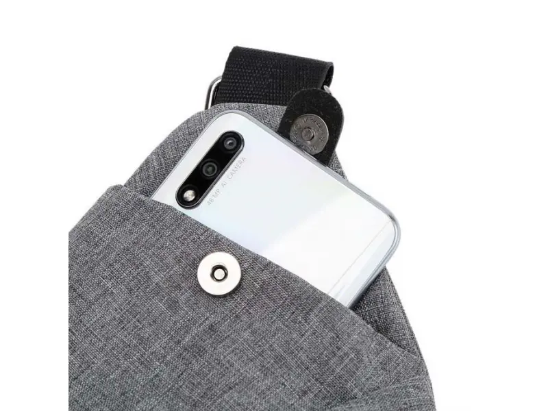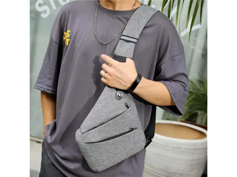 Λεπτή ανδρική υφασμάτινη τσάντα - Μια ανδρική τσάντα που μπορεί να φορεθεί στο στήθος, τον ώμο ή την πλάτη σαν σακίδιο πλάτης. - Μία κύρια θήκη με φερμουάρ. - Εσωτερική τσέπη χωρίς φερμουάρ. Τσέπη με φερμουάρ. - Δύο μπροστινές τσέπες με φερμουάρ. - Μπροστινή τσέπη με κλείσιμο με μαγνητικό κουμπί. Ρυθμιζόμενος ιμάντας ώμου.
